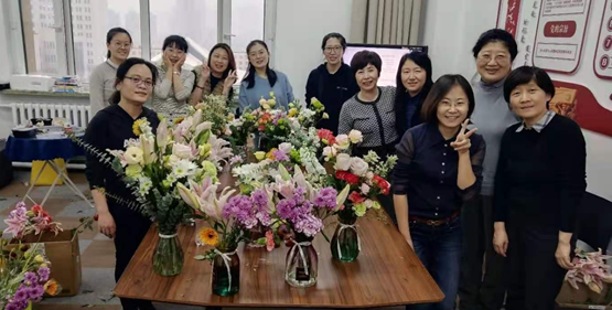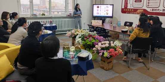 11月17日中午,学校14名教职工在理学楼715参加了伟德bv1946官网“午间拾光”系列教工沙龙。此次活动邀请黑龙江大学艺术设计硕士毕业生刘丹阳为教职工进行瓶插花花艺技巧培训。