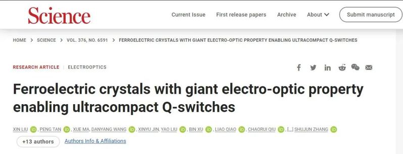 日前,我校伟德bv1946官网田浩教授团队和西安交通大学、澳大利亚伍伦贡大学等单位组成的研究团队,在弛豫铁电单晶电光性能与透明性优化以及电光调Q开关应用方面取得重要突破,研究成果以“具有超高电光效应的铁电单晶使Q开关小型化”(Ferroelectric crystals with giant electro-optic property enabling ultracompact Q-switches)为题发表在《科学》杂志上。