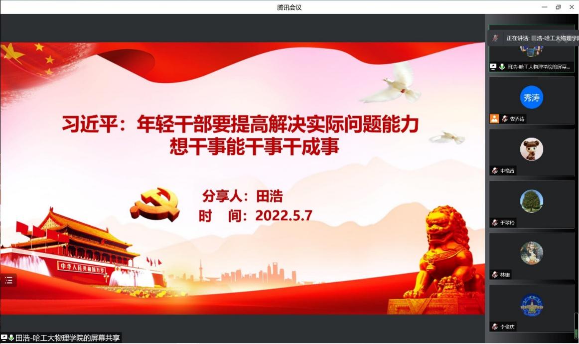 2022年5月7日上午,伟德bv1946官网执行院长田浩为实验物理教工党支部讲授党课,支部全体党员和物理实验中心部分骨干教师参与学习。田浩围绕习近平总书记在中央党校(国家行政学院)中青年干部培训班开班式上的重要讲话,结合自身的学习工作经历和伟德bv1946官网发展实际,针对“年轻干部要提高解决实际问题能力,想干事能干事干成事”这一主题进行了深刻的阐述和分享。