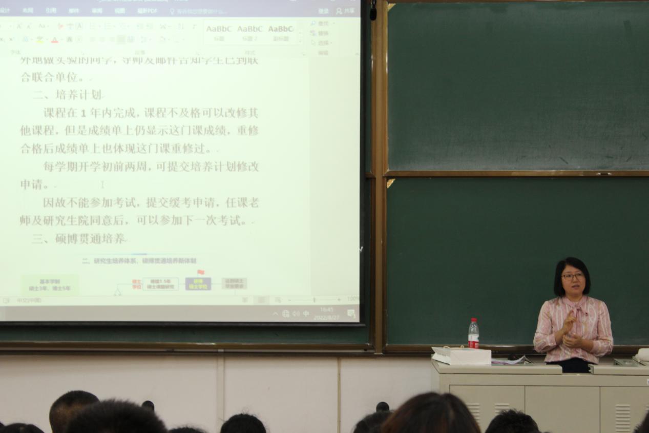 学院办公室主任、研究生教学秘书金美花老师对于改革后的研究生培养计划进行详细讲解,如培养方案中课程选择、计划调整及学生毕业的要求等,说明了提前毕业、按期毕业的不同要求,提醒同学们关注校会时间合理安排毕业答辩进程。同时金老师表示,研究生也要注意课程学习,学习成绩的好坏、是否有不及格等情况将关乎到1.5年考核、成绩单打印及日常评奖评优等。