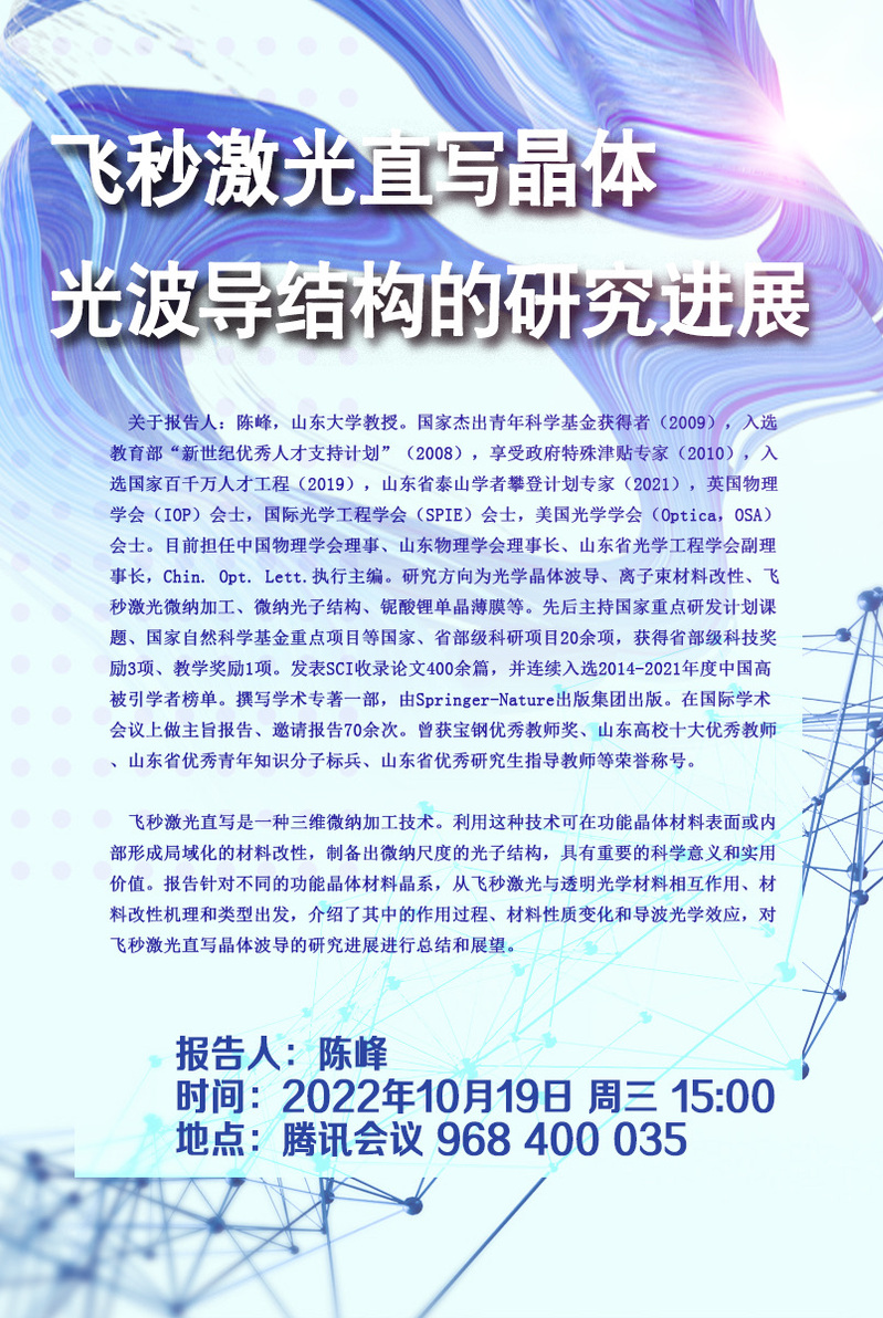 飞秒激光直写晶体光波导结构的研究进展讲座通知