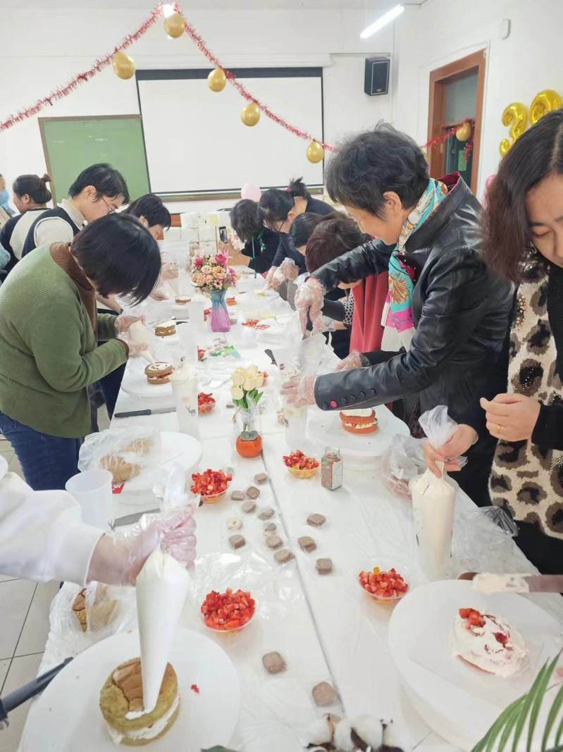 在资深糕点师的专业指导下,老师们学习了蛋糕制作的基本技巧。通过自己的努力,每个人都成功完成了蛋糕的初步造型。现场准备了糖珠、时令水果、巧克力等丰富的装饰材料,老师们发挥创意,用自己喜爱的夹心材料,运用裱花技巧,将平淡无奇的蛋糕坯装点得色彩斑斓、各具特色。大家边品尝香浓的果茶,边欣赏彼此的作品,分享心得体会,现场氛围温馨而又热烈。