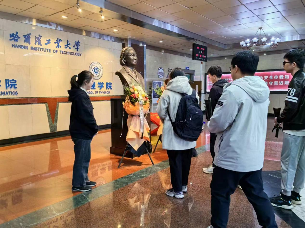 上午9时,党员同学们于理学楼洪晶先生雕像前开展祭扫活动。主持人吴瑶带领大家重温了学术大师的奋斗故事和许党报国之志,引导广大学生党员在哈工大“八百壮士”精神引领下砥砺奋进。接着,全体同学共同默哀,在肃穆的氛围中表达对洪晶先生的敬仰与哀思。