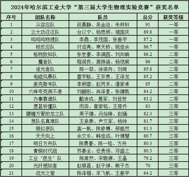附:2024年哈尔滨工业大学“第三届大学生物理实验竞赛”获奖名单