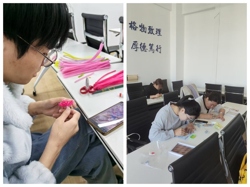 活动现场,同学们首先学习了钻石画的点钻技巧、花朵挂饰的编织方法,掌握了基本技能后,大家便迫不及待地挑选自己心仪的钻石画图案和花朵挂饰材料包,开启了自由创作之旅。在创作过程中,同学们各显神通,有的同学巧妙地将一颗颗钻石拼凑成精美的图案,有的同学用丝绒棒制作出栩栩如生的花朵。大家相互交流、分享创意,现场气氛温馨且热烈。经过同学们的精心制作,一件件精美的作品新鲜出炉。这些作品展现了参与者动手能力和创造力,同学们更是在制作过程中体验到了手工活动带来的乐趣与成就感。