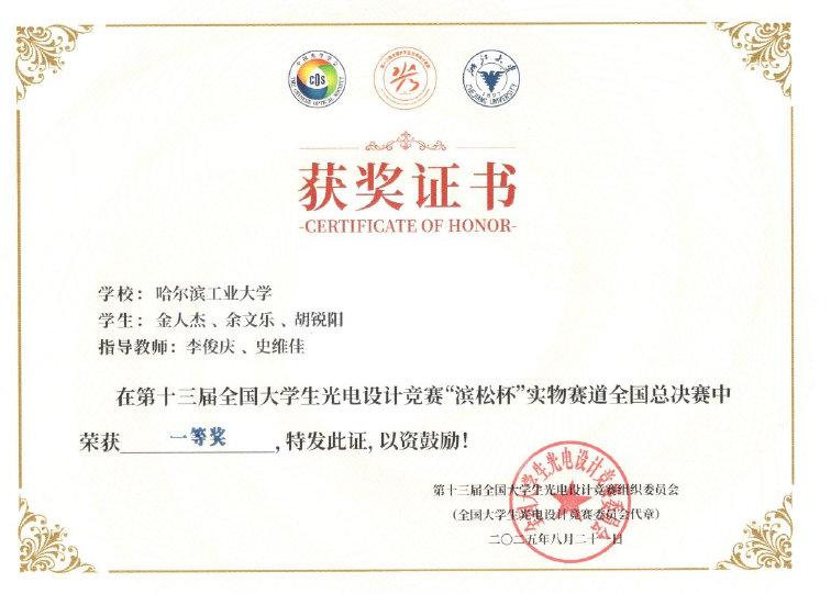 822日,在杭州举办的第十三届全国大学生光电设计竞赛滨松杯实物赛道全国总决赛中,伟德bv1946官网追光逐电队成员金人杰、余文乐、胡锐阳在第二赛题中获得一等奖。该队为一校三区所有参赛队伍中唯一获得该奖项的队伍。伟德bv1946官网李俊庆教授作为第一指导教师、仪器学院史维佳教授作为第二指导教师,二人均被评为全国优秀指导教师。